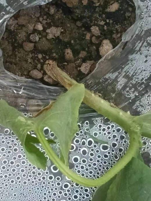 症状描述:黄瓜苗子定植25天,出现茎基部腐烂变褐的情况,严重的苗子死亡。