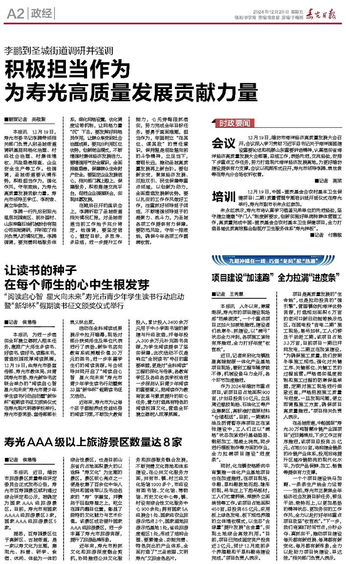 近年来,寿光市抢抓文化和旅游深度融合契机,协同推进公共文化服务和旅游服务融合发展,不断完善文化阵地和体系建设。在公共文化服务方面,共有市、镇、村三级文化场馆1000多个,市级设有图书馆、文化馆、博物馆、历史文化中心等,镇、村设有综合性文化服务中心900余处;拥有国家5A级展会1处、国家级农业旅游示范点2个,国家湿地旅游示范基地1处,省级旅游度假区1处,形成了结构合理、要素健全、功能完善、特色突出的产业体系,全面打造了“三圣故里、文明寿光”文旅金色名片。